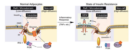 肥満モデルマウス(ob/obマウス)やラット(Zucker fa/faラット)の脂肪組織を解析したところ、コントロール群と比較してGM3合成酵素遺伝子の発現が上昇し、GM3発現レベルが著明に増加していることが明らかとなった。この変化が細胞レベルでも再現されるのかを検証するため、3T3-L1細胞を脂肪細胞へ分化させ、低濃度のTNFαを作用させた。その結果、脂肪細胞は慢性炎症惹起を伴うインスリン抵抗性を示し、脂肪組織と同様にGM3発現の上昇が確認された。さらに、この細胞をGM3量を低下させる薬剤 D-PDMP(グルコシルセラミド合成酵素阻害剤)で処理すると、インスリン抵抗性が解除され、正常なインスリンシグナル伝達へと回復した(Tagami S. et al., 2007, Kabayama K. et al., 2005 and 2007)。